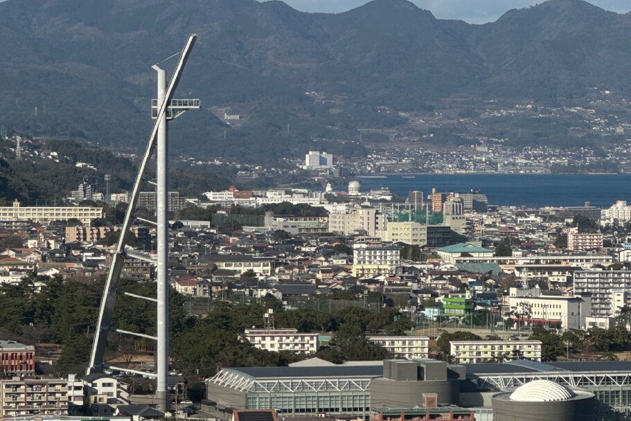 2本の支柱とそれを支える弧状の柱がユニークなデザインのビーコンプラザのシンボルタワー。地上100mに位置するガラスの箱のような印象の展望台から別府市内を一望することができます。昼間は別府温泉の立ち上がる湯気、青く広大な海、標高1,375mの鶴見岳などの大パノラマが、夜には「日本夜景遺産」に認定されたムード満点な街の煌めきが眼前に広がります。