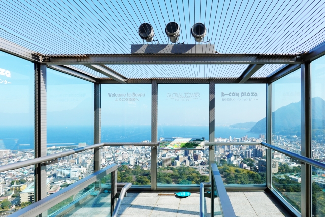 2本の支柱とそれを支える弧状の柱がユニークなデザインのビーコンプラザのシンボルタワー。地上100mに位置するガラスの箱のような印象の展望台から別府市内を一望することができます。昼間は別府温泉の立ち上がる湯気、青く広大な海、標高1,375mの鶴見岳などの大パノラマが、夜には「日本夜景遺産」に認定されたムード満点な街の煌めきが眼前に広がります。