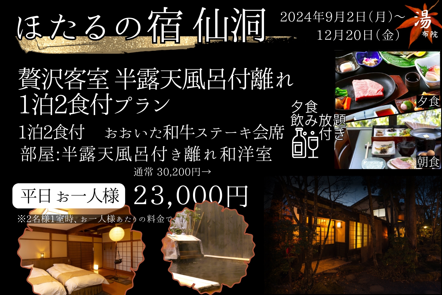 和室、洋室、内風呂付きのお部屋など、